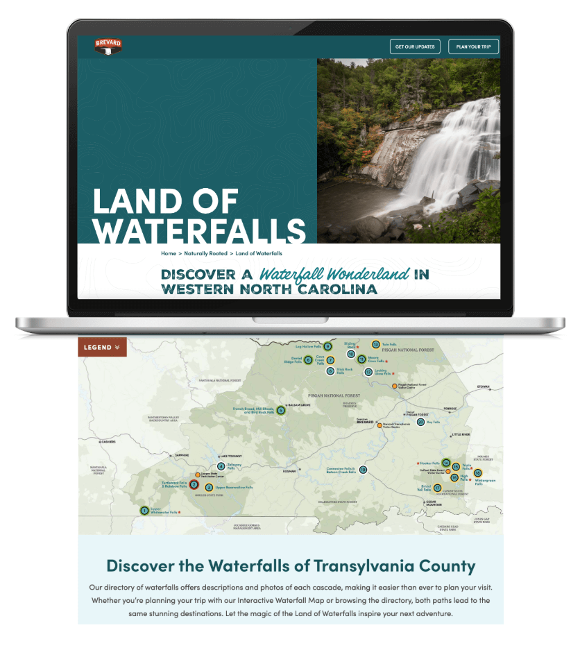 One of the crown jewels of the site is the Land of Waterfalls landing page—an immersive experience that turns Transylvania County’s 250+ waterfalls into an interactive, choose-your-own-adventure. Designed to inspire both seasoned explorers and first-time visitors, the map lets users sort, plan, and discover cascades based on location, hike difficulty, or type of waterfall. Whether it’s a roadside stop or a backcountry reward, this tool transforms trip planning into an exploration in itself—connecting people to the landscape before they even set foot on a trail. It’s not just a feature. It’s a reason to come.