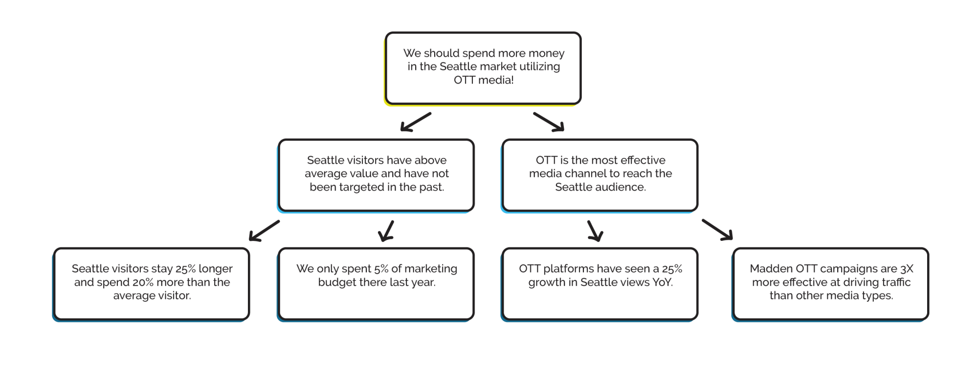 Your marketing KPIs (or other tactical level measurements) should connect your organization’s efforts to specific, key arguments which collectively support the indicated achievement of a KBO. In other words, if a KBO is to increase tax revenues by 10%, and increasing visitation from Seattle would help achieve that goal (because your data says people from Seattle stay longer and spend more per trip), the key argument is measuring the increase in visitors from Seattle. At the same time, the supporting details spell out all the efforts your organization took to draw those visitors to the town.