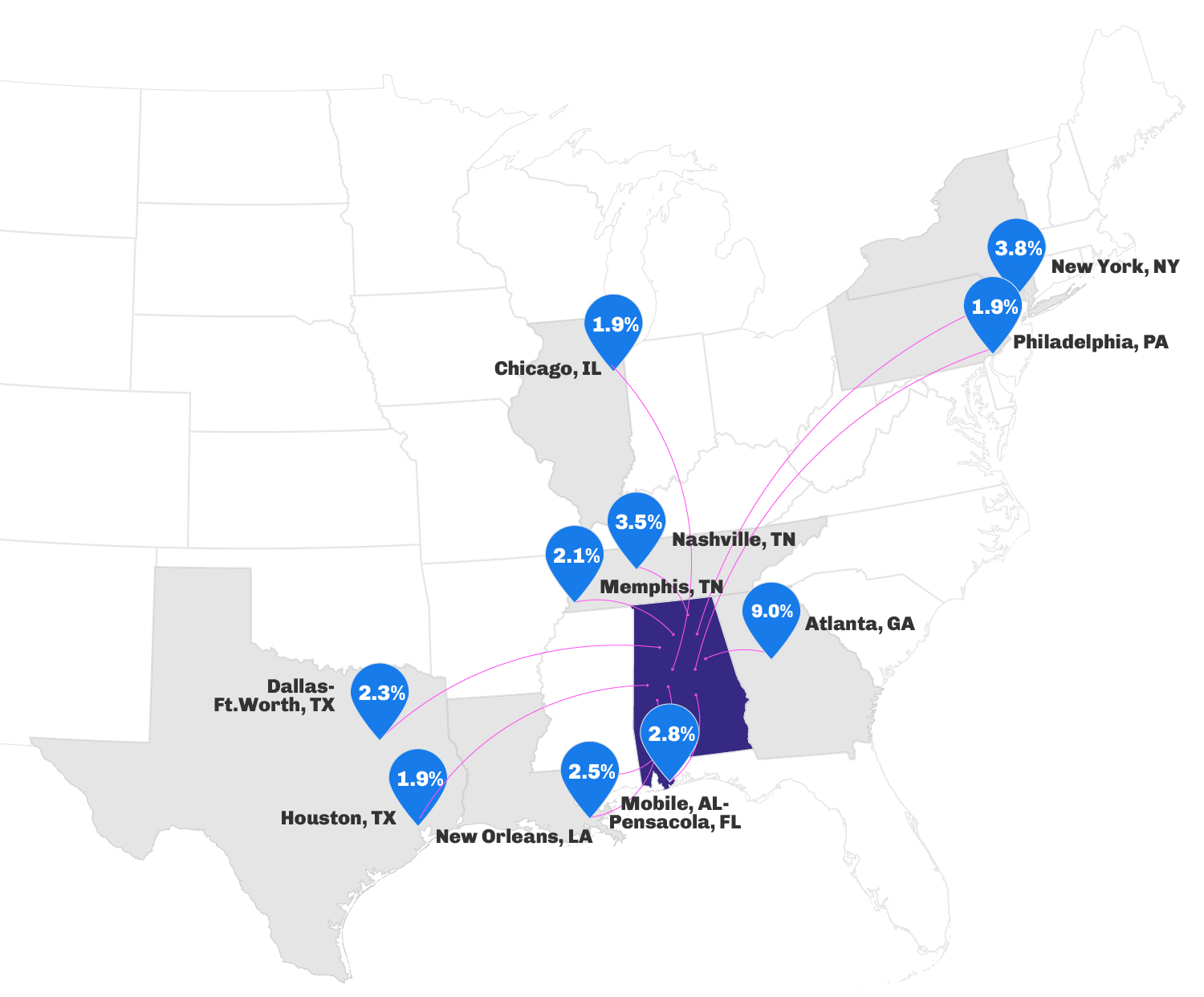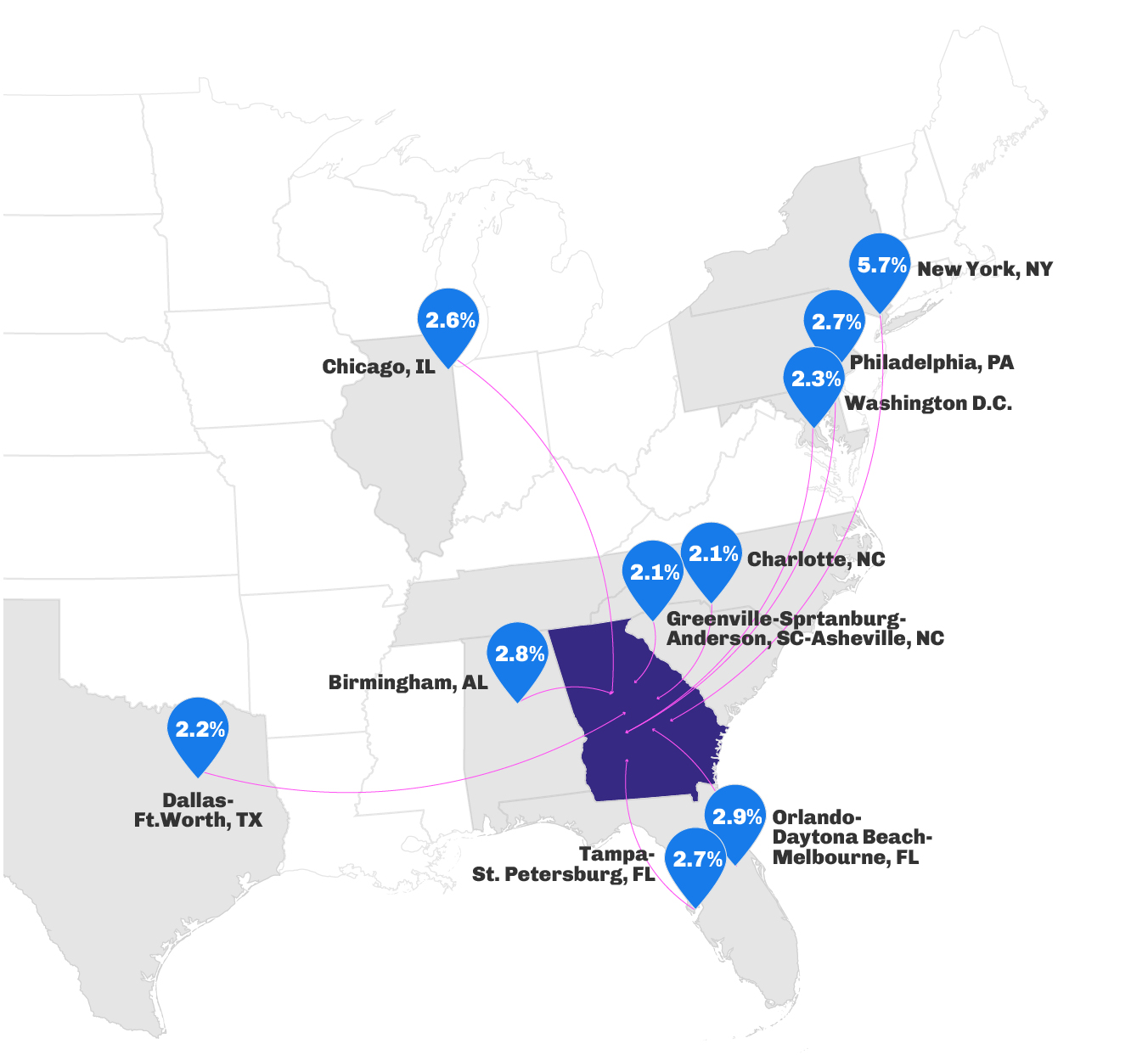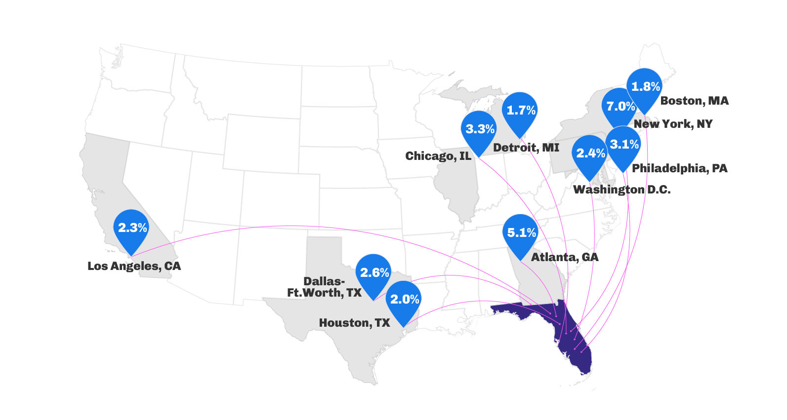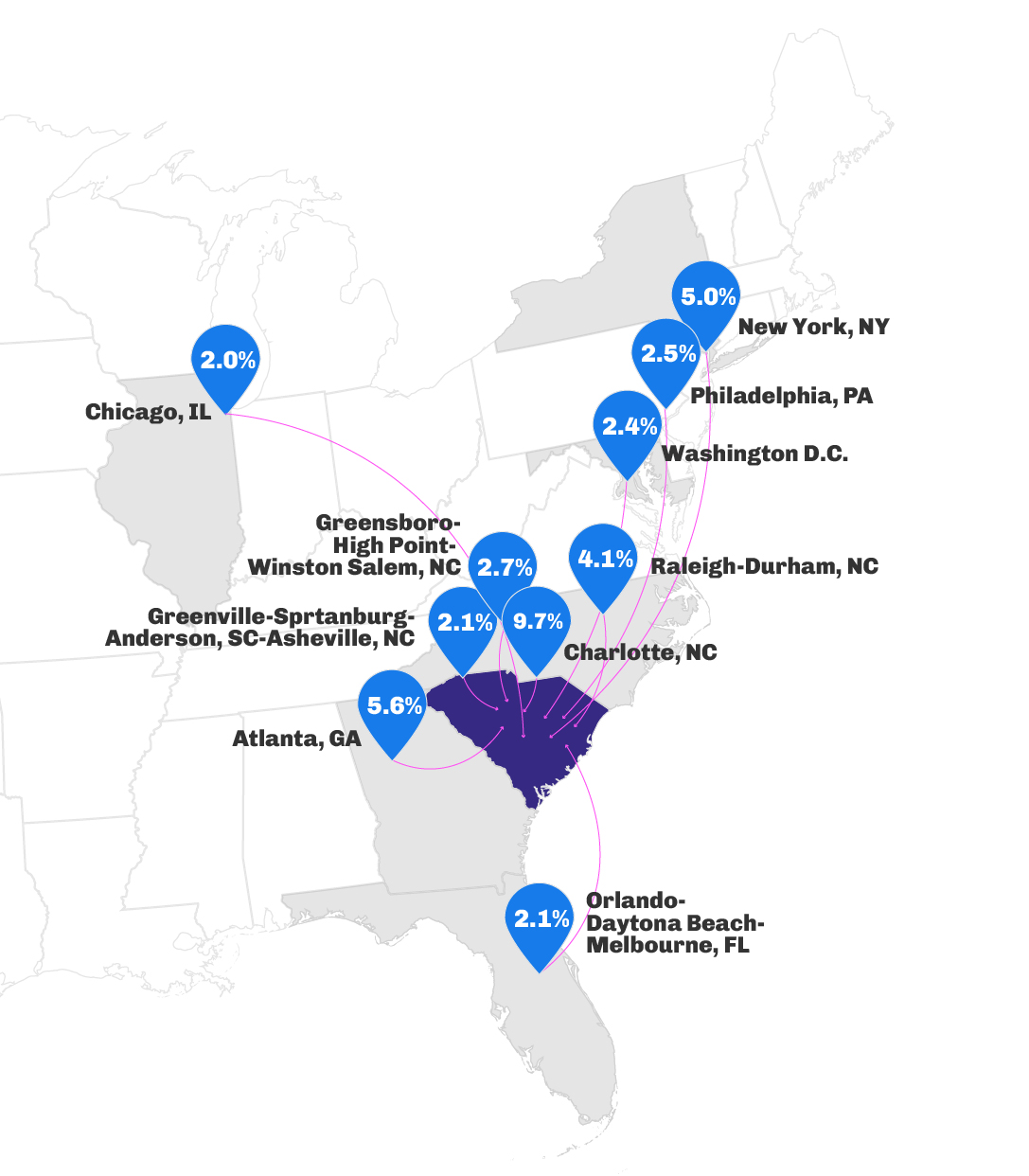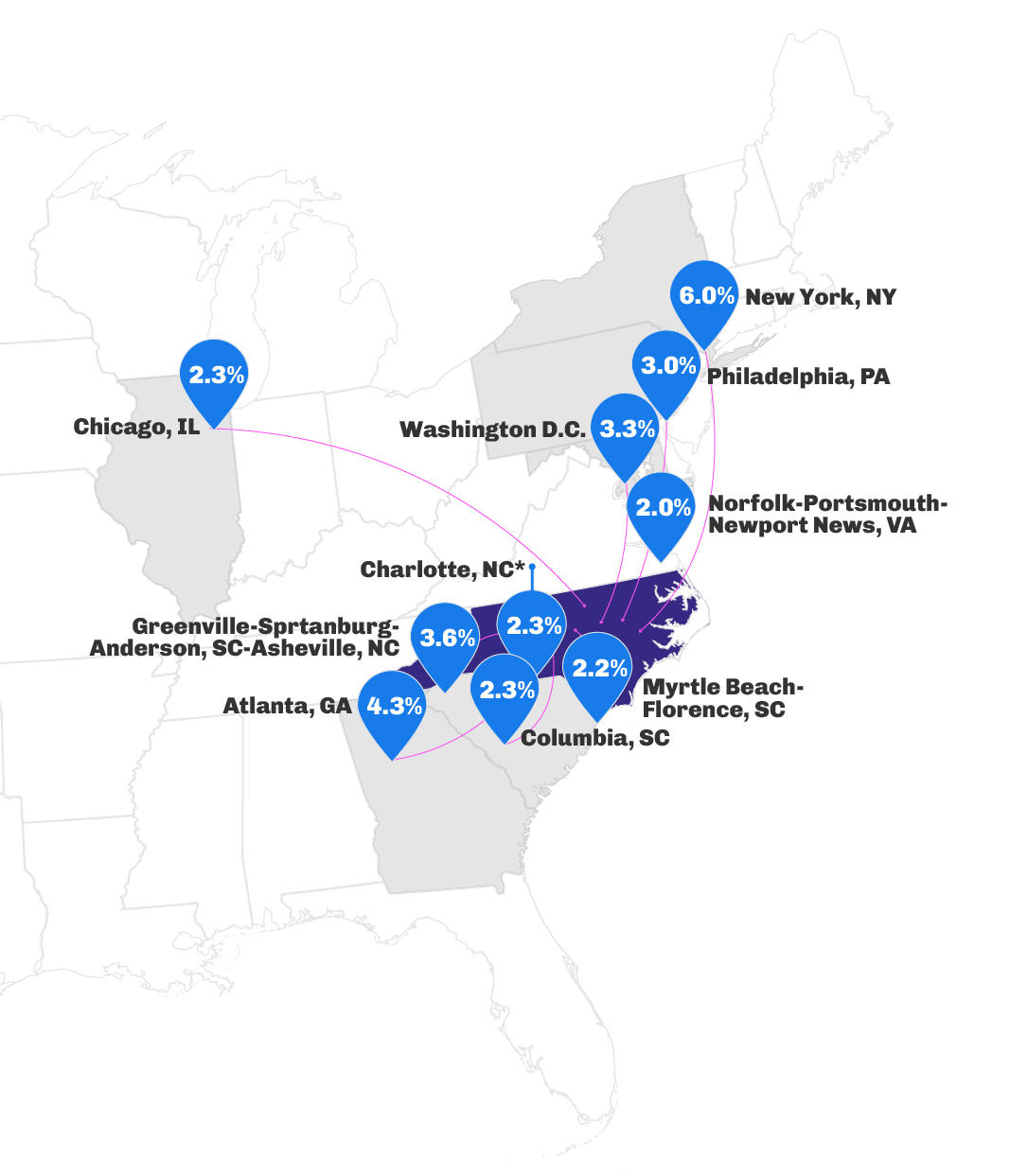 - New York City and Chicago were two reliable origin markets for the Northeast that dropped their inbound traffic YOY
