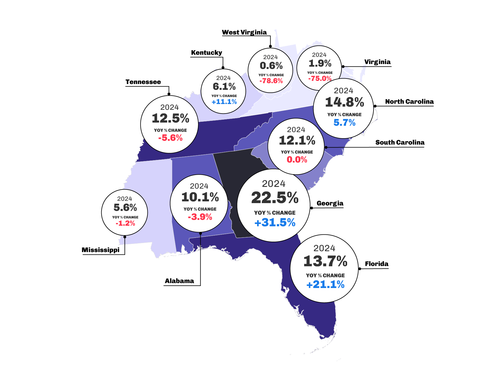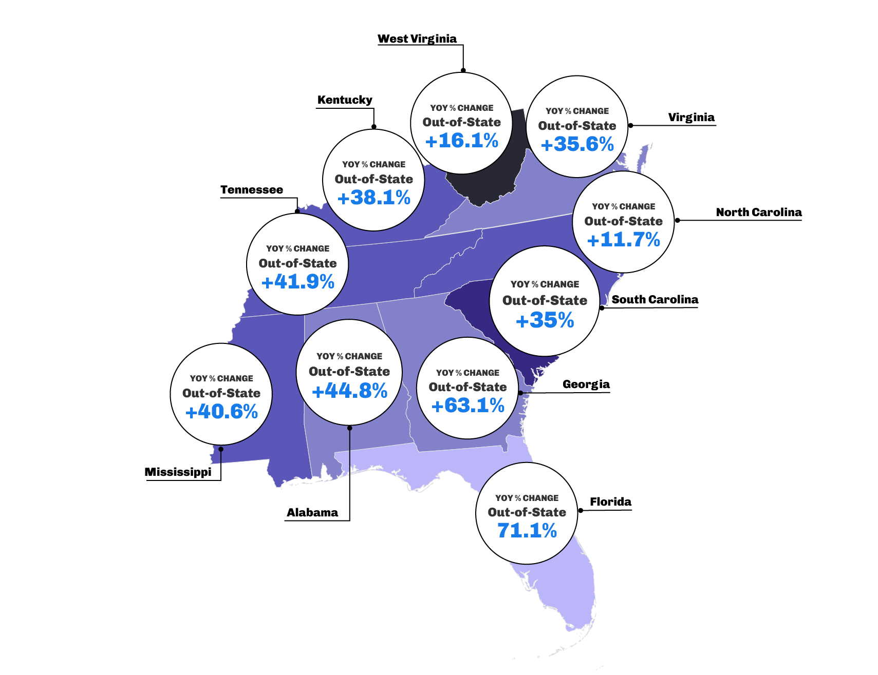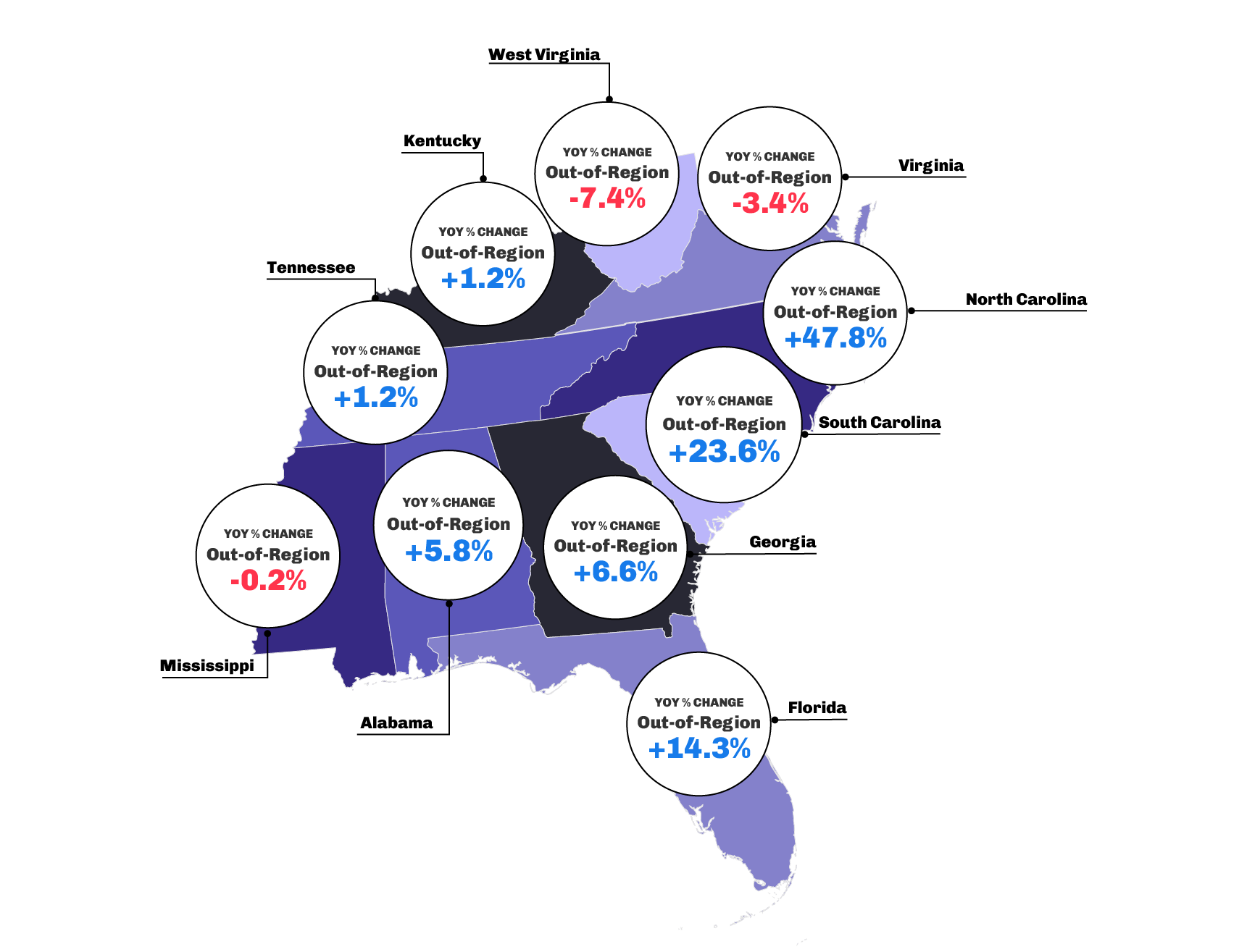 - Kentucky, Tennessee and West Virginia experienced YOY decreases in regional visitation