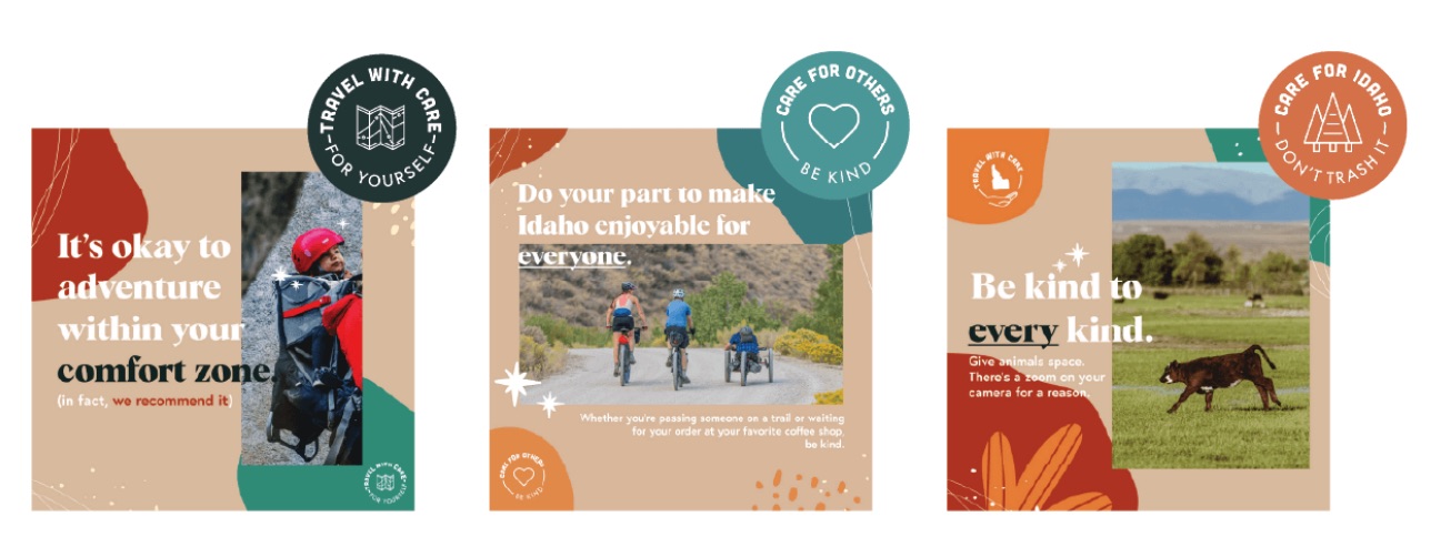 When Visit Idaho experienced a surge in visitation, it recognized the importance of protecting the very places and communities that helped fuel that growth. Visit Idaho launched the “Travel With Care” initiative with messaging on how to experience Idaho in a responsible way, centered around the campaign’s three core pillars—care for Idaho, care for yourself, and care for others. “Travel With Care” is housed within the Visit Idaho brand but allows for a fresh, creative tone that stands apart. It acts as a flexible platform for all sustainable tourism and overtourism messaging. To ensure it resonates, the campaign strikes a friendly, conversational tone—avoiding anything that feels preachy. Colorful, illustrative visuals paired with quick, witty copy keep the message approachable while still delivering impact.